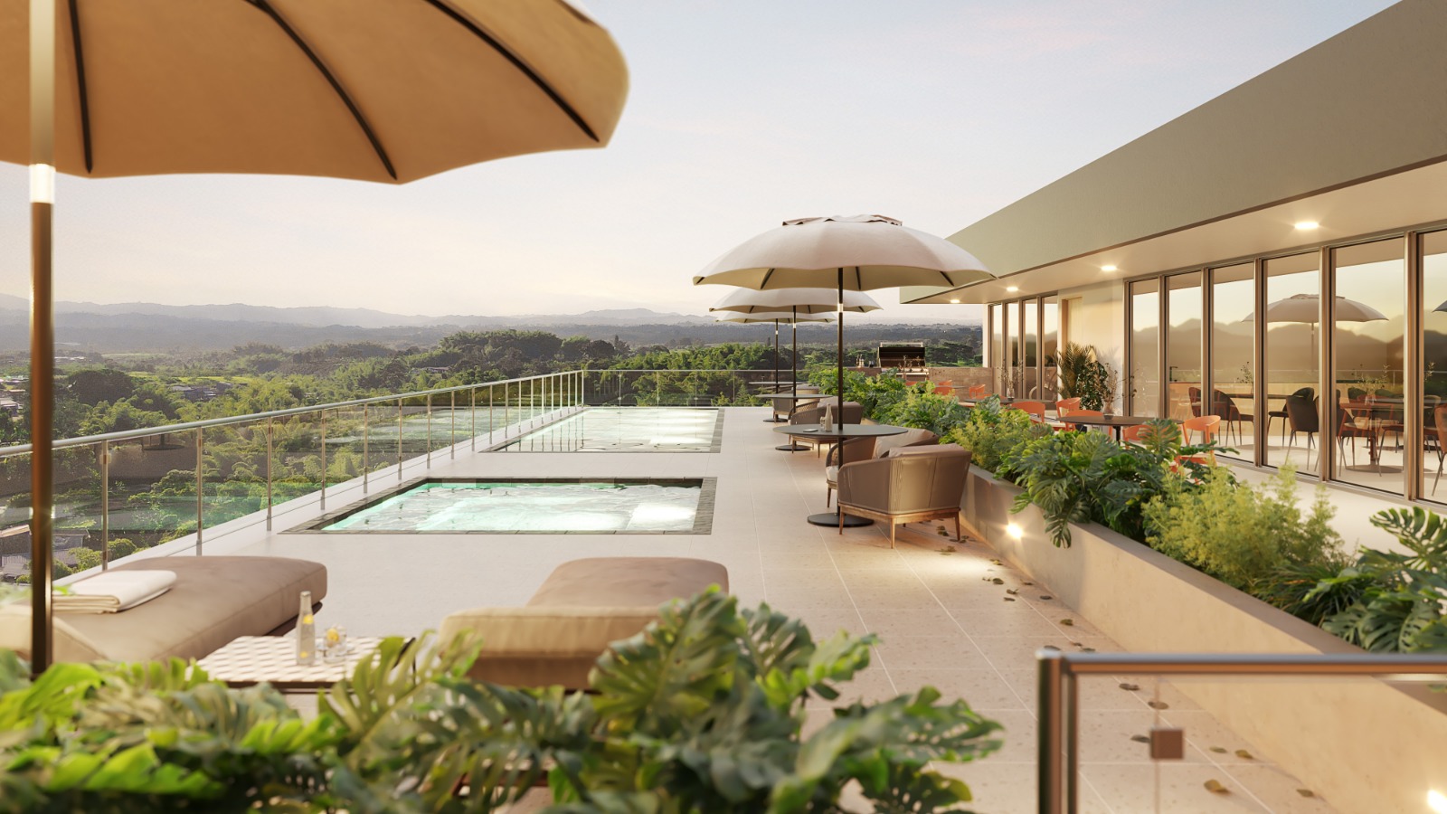 Incluye apartamentos en diferentes tipologías, ascensor panorámico, parqueaderos y áreas comunes rodeadas de un entorno natural.